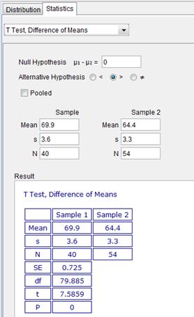 The last piece of the puzzle before we find the P-value is the degree of freedom, which has a fairly complex form that you can locate in the textbook. Since it's typically not an integer, it's common for people to use the smaller of the two sample size less one to approximate this degree of freedom (39 in our case). If you are interested in the exact degree of freedom, the TI-calculator or software like GeoGebra can also compute this value. (you will need to go to the Statistics calculator, “T Test, Difference of Means”. See the screen capture below)