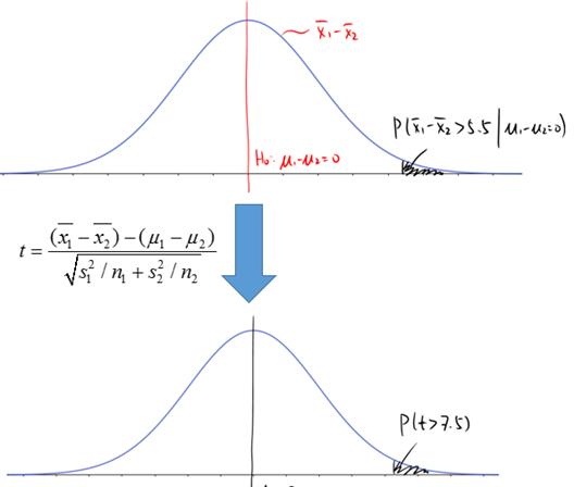 Just like the hypothesis testing for one mean, the P-value for this test can also be interpreted in the same framework of “the chance of seeing the evidenced, given that H0 is true”, except that the sampling distribution is the difference of the two sample means: